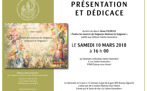 Le 10 mars prochain, à 16 h, M. Alain Ficheux, diacre du diocèse d'evra, présentera son livre-album Toutes les oeuvres du Seigneur, bénissez le Seigneur, paru aux Éditions Sainte-Geneviève. Mgr Michel Dubost, évêque émérite d'Évry, participera à la présentation.