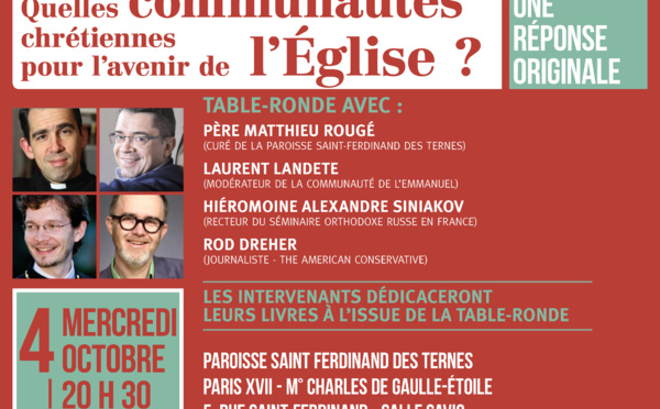 La paroisse Saint-Ferdinand des Ternes à Paris organise le 4 octobre à 20 h 30 une table-ronde "Quelles communautés chrétiennes pour l'avenir de l'Église?" Quatre intervenant y prendront part: le P. Matthieu Rougé, curé de la paroisse, M. Laurent Landete, modérateur de la Communauté de l'Emmanuel,...
