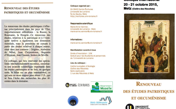 L'Université de Metz organise le 20 et 21 octobre 2015 un colloque ayant pour thème: "Le renouveau des études patristiques et l'oecuménisme". Le programme est disponible sur le site de l'université, en suivant ce lien. Le renouveau des études patristiques s’effectue principalement dans les pays de...