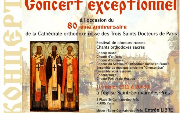 Le choeur des séminaristes, sous la direction de Dimitri Garmonov, participera au concert de musique liturgique russe qui sera donné le 10 février 2011 à l'église Saint-Germain-des-Prés à Paris, à l'occasion du 80e anniversaire de la fondation de l'église des Trois-Saints-Docteurs.